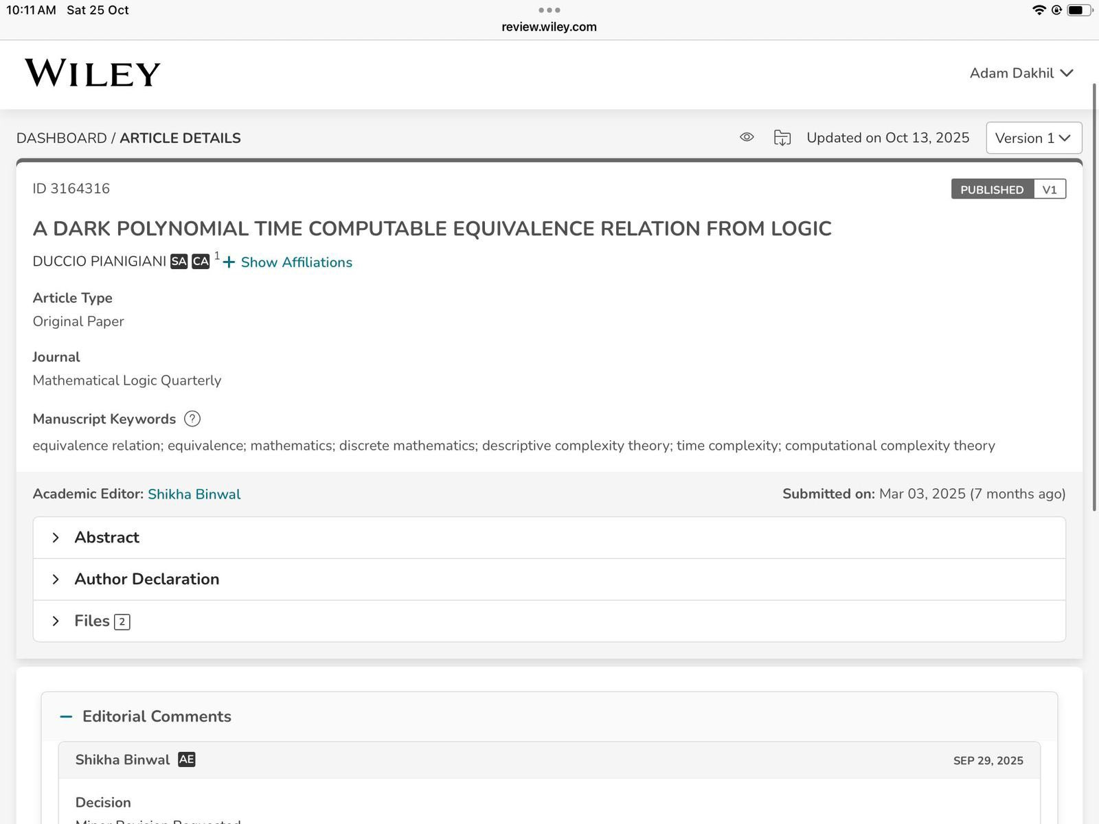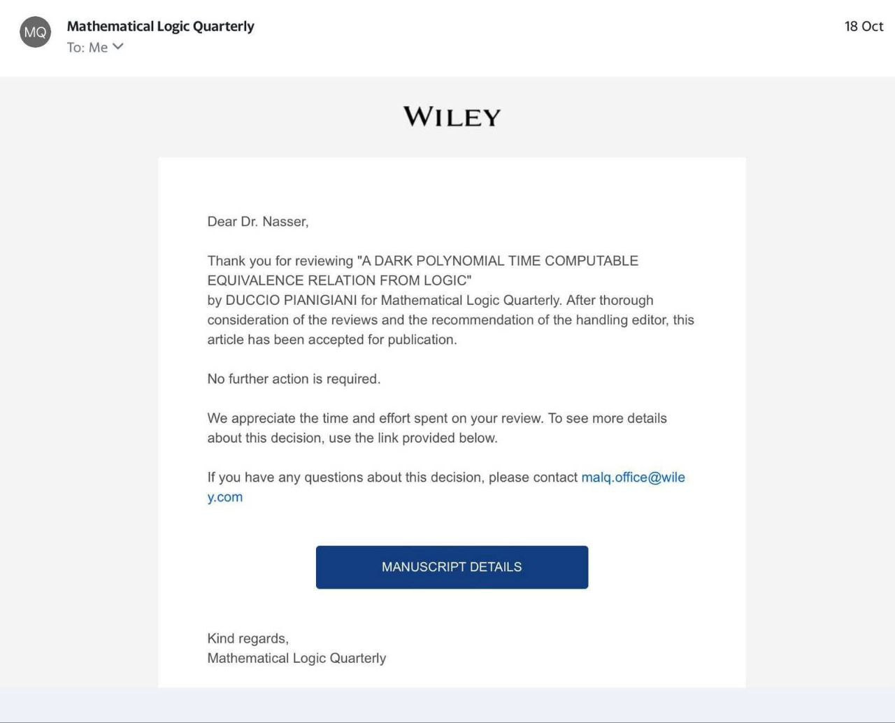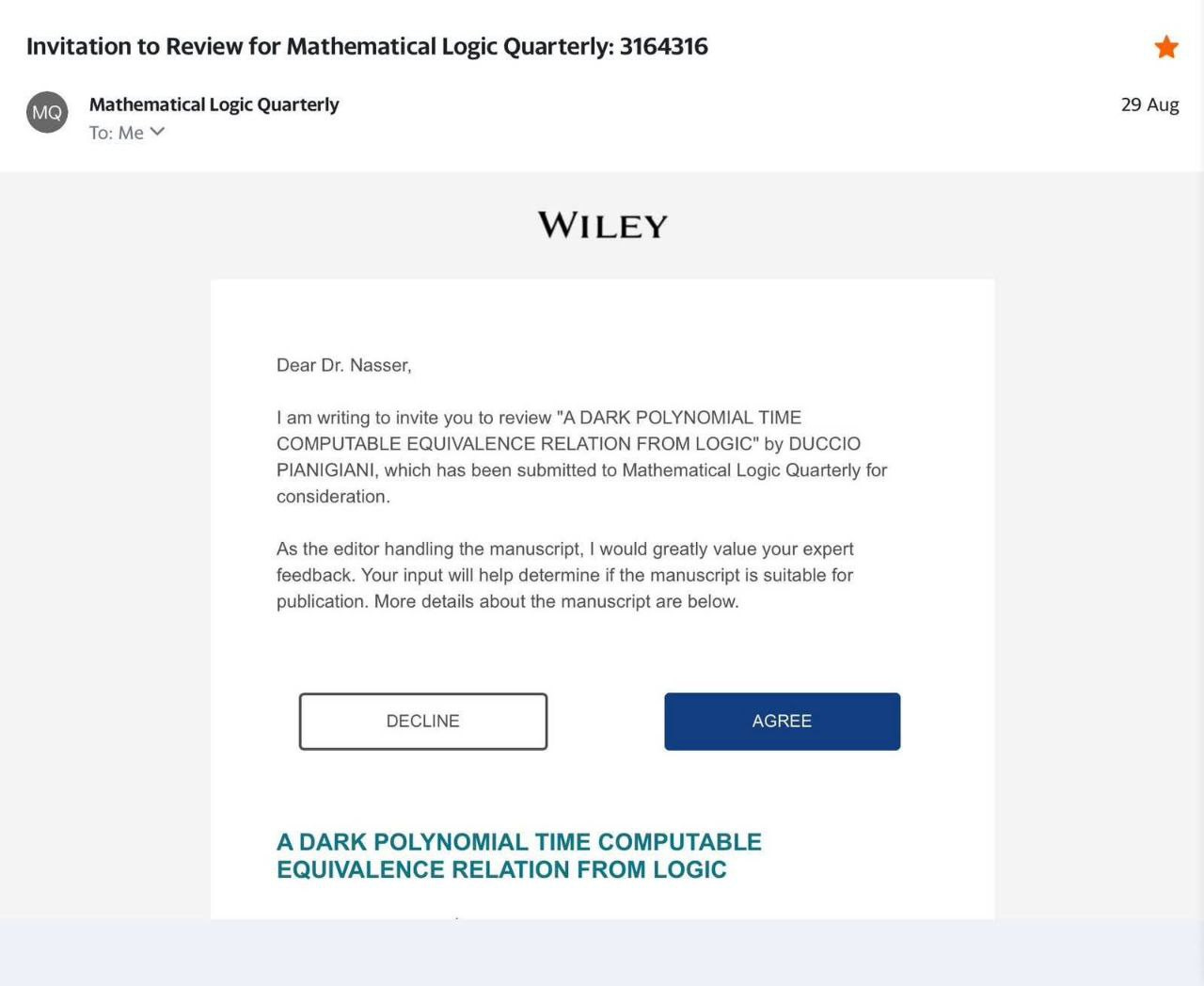 Given the demonstrable contradictions in Nasser’s profile, it is highly likely that the journal’s new management (or, more likely, an automated “reviewer finder” system) was fooled by his keyword stuffed profiles. The system saw “Dr. Nasser” and keywords like “Mathematical”, “Quantum” and “Computing” and sent an automated invitation to review a paper called “A DARK POLYNOMIAL TIME COMPUTABLE EQUIVALENCE RELATION FROM LOGIC” in a field he had no qualifications for.